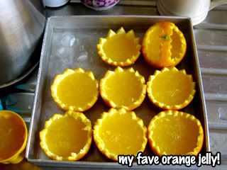 Orange jelly... My fave when I was a kid! That took a helluva effort to juice, to cut and to prepare the jelly. *wipes sweat off head* I'll make sure I enjoy the effort by eating my jelly slowly now when my mum makes them...