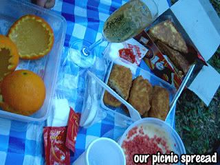 Our picnic spreeeeaaaaaaaaad of food! Oven-baked fish fillet, ham & cheese grilled sandwiches, mashed potatoes with bacon bits, orange jelly and sparkling apple juice! x)