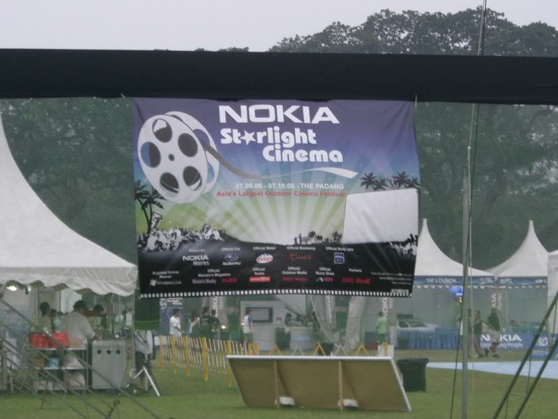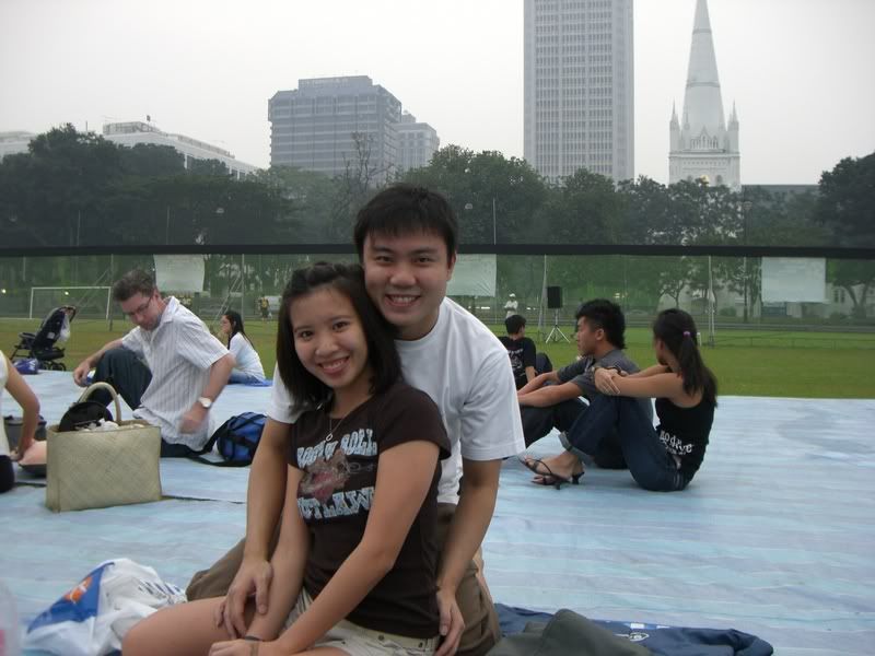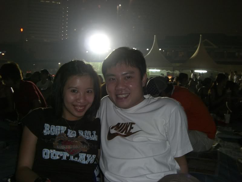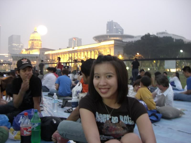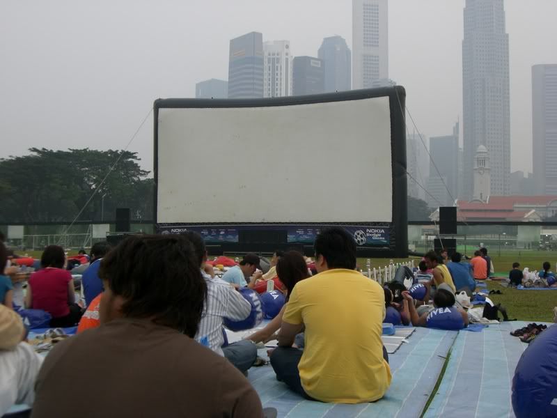 It's getting darker, we're all waiting for the movie to commence. In the meantime, the band Dubious Brothers rocked on.. They are pretty good I must say! I don't know the title for the opening song they did, but the lead singer sounded EXACTLY like the original singer!! *gasp* Both me and Bern was shocked at the radio quality-like voice... But yah lah, it's really the guy singer singing. *thumbs up* And yah.. as you can tell, pretty hazy! When I got home, PSI level was 140!!!