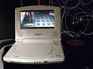 My own portable DVD player with my choice of movie, with a glass of grape juice behind.