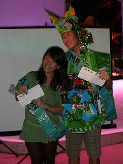 Yup, you're looking at our winners for the night, Miss Green and Mr Green! :) For the lady, she recycled a old t-shirt, used a measuring tape as her belt and did some other kooky things in the spirit of recycling if I'm not wrong. For the guy, oh well. He had used several green Nickelodeon decorations that we usually see hanging in the office to make his outfit. :) Both of them walked away with $400.