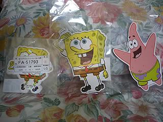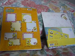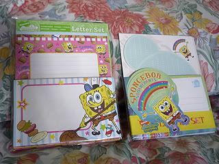 Not too sure about the set on the right as some text are in Japanese but I reckon it's 2 designs x 8 sheets of letter paper and 1 design of 8 pieces of envelopes and comes with some Spongebob stickers too.