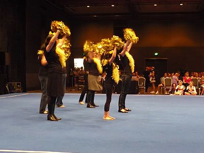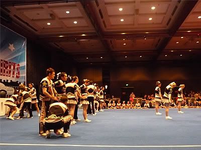 Though I've commented that this competition was confusing and maybe a little boring for me, it is an eye-opener. Never had I see freak accidents happen or cheerleaders running off the mats during the competition itself. I didn't snap a picture of the freak accident but to paint a picture in your head, the flyer landed on her neck. major ouch. :( And she just laid there and didn't move a single bit. The competition had to be stopped and the medics came to take her away close to 30 minutes later. A cheerleader from another team probably got elbowed in the nose and she ran off the mats while they were competing, leaving her team slightly lost.