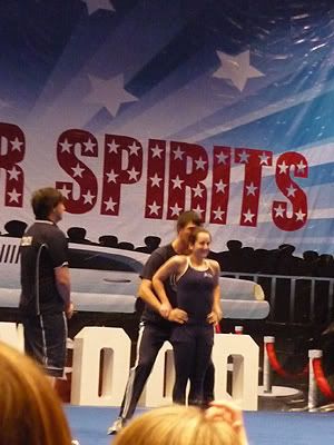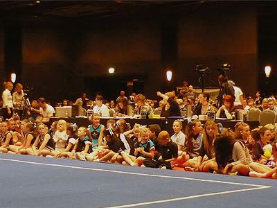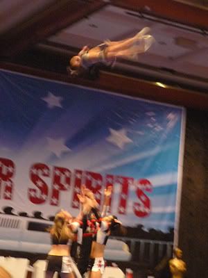 Cheerleaders from various squads doing their tumbling warm-up. It's really interesting to watch because they are from different squads and I don't know how on earth do they coordinate who goes first/next because they were all coming in from different parts of the mats.